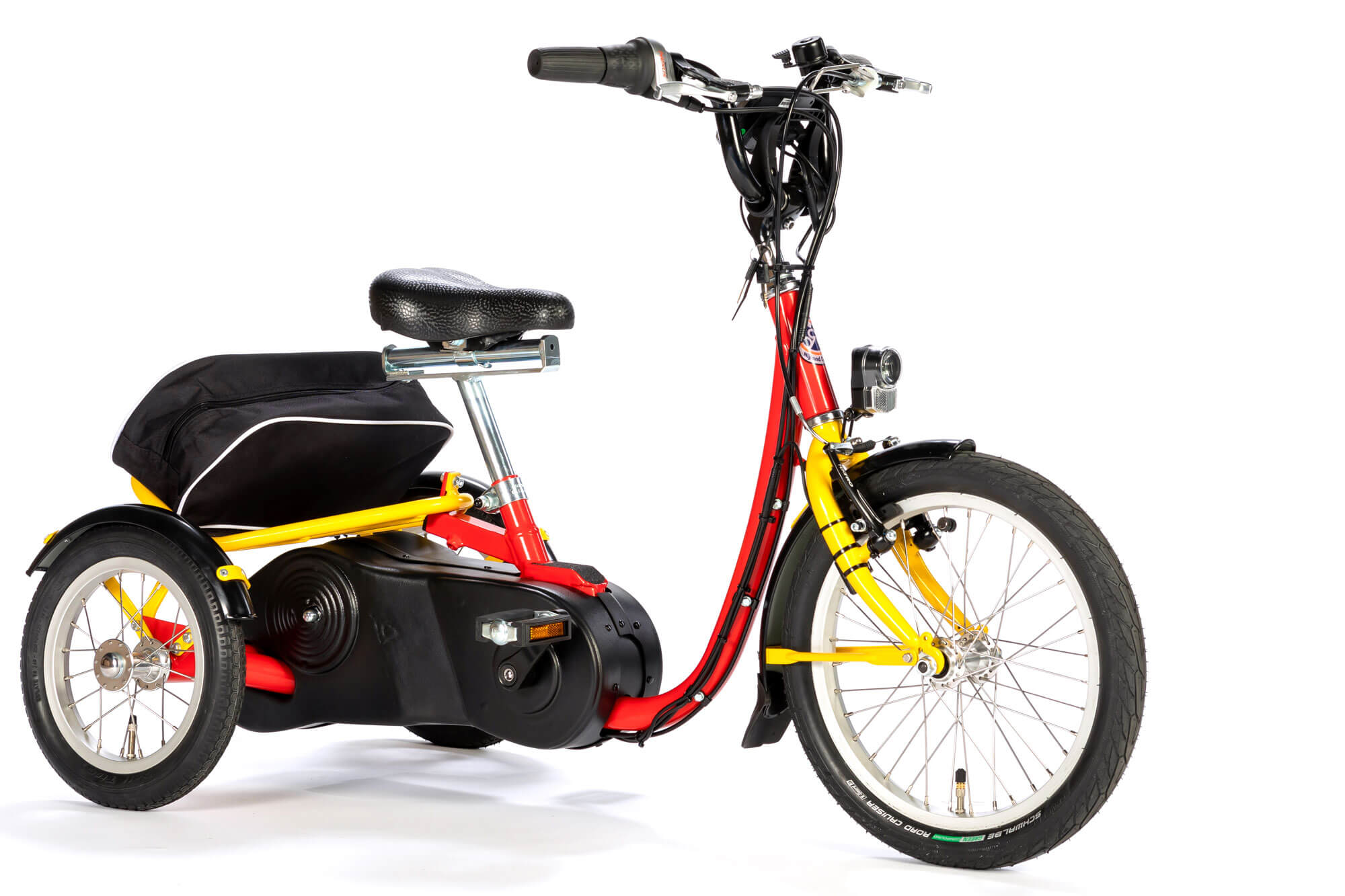 Trehjuls sykkel med gir og hjelpemotor. Skrittlengde 37 - 51 cm.