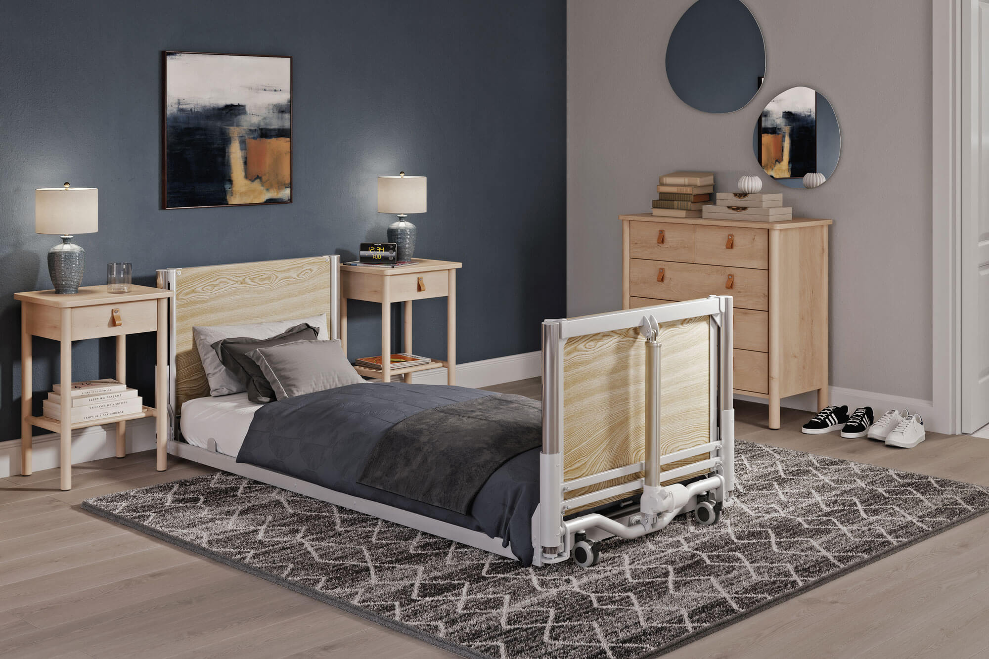 En trygg og sikker gulvseng med lav liggehøyde for bruk i hjemmet og institusjoner! Sengens høyde er en betydelig faktor knyttet til skader som følge av fall. Forskning tyder på at en seng på gulvnivå med en høyde på 100 mm eller mindre fra gulvet* er optimal for å redusere risikoen for skader forbundet med fall fra sengen.
