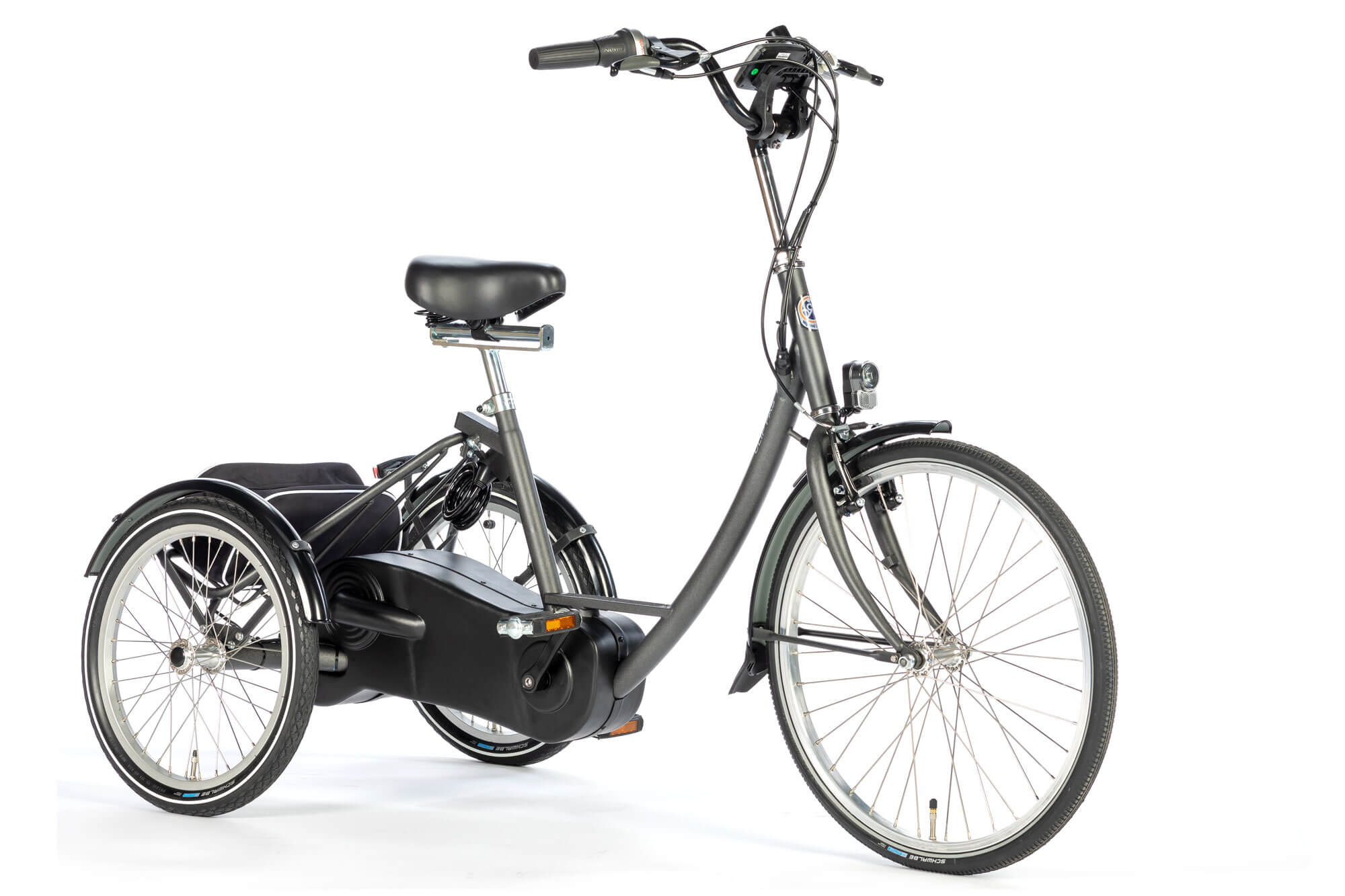 Clip E er en robust og stabil trehjulsykkel med hjelpemotor. Skrittlengde 60-85 cm.