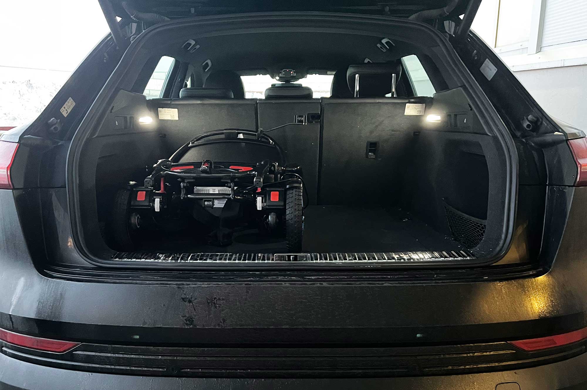 Ingen avanserte mekanismer - bare trekk i klipsen på stolens rygg, fell inn fotplaten og trykk stolen sammen ved å trykke ryggen nedover. Du trenger ikke å fjerne batteriene før den legges sammen. For ekstra sikkerhet (standard) kan du stramme transport-stroppen for å sikre at Q50 R Carbon holder seg sammenfoldet når den løftes.