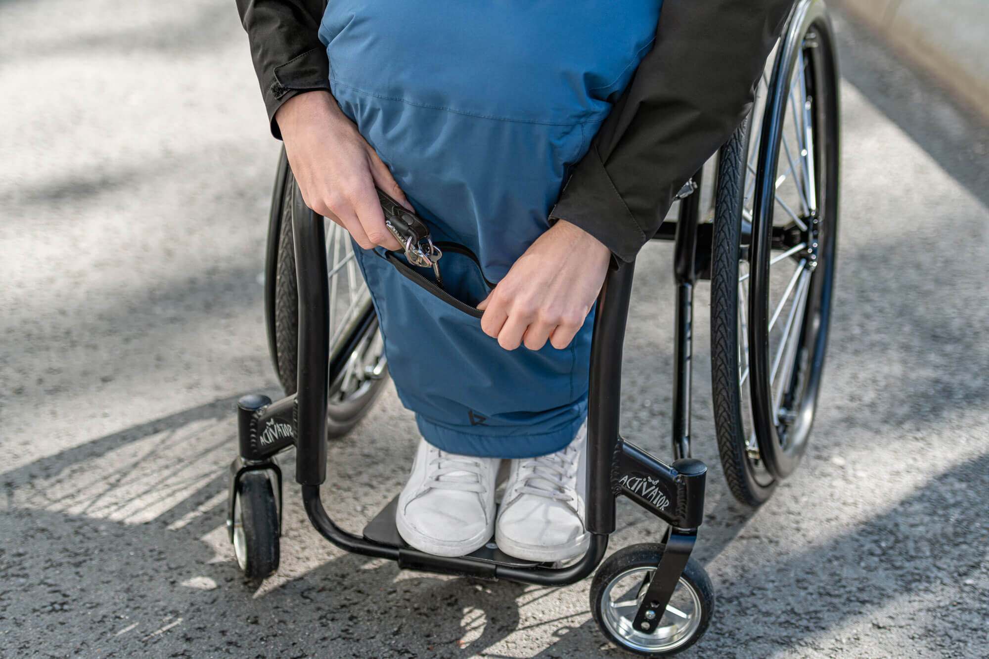 Varmeposen eller regntrekket festes rundt livet ved hjelp av et regulerbart bånd med spenne. Stram til etter eget ønske. Det er lange reguleringsbånd, noe som fasiliterer for at festespennen kan plasseres i siden. På denne måten kan du forbli sittende i rullestolen under hele prosessen.