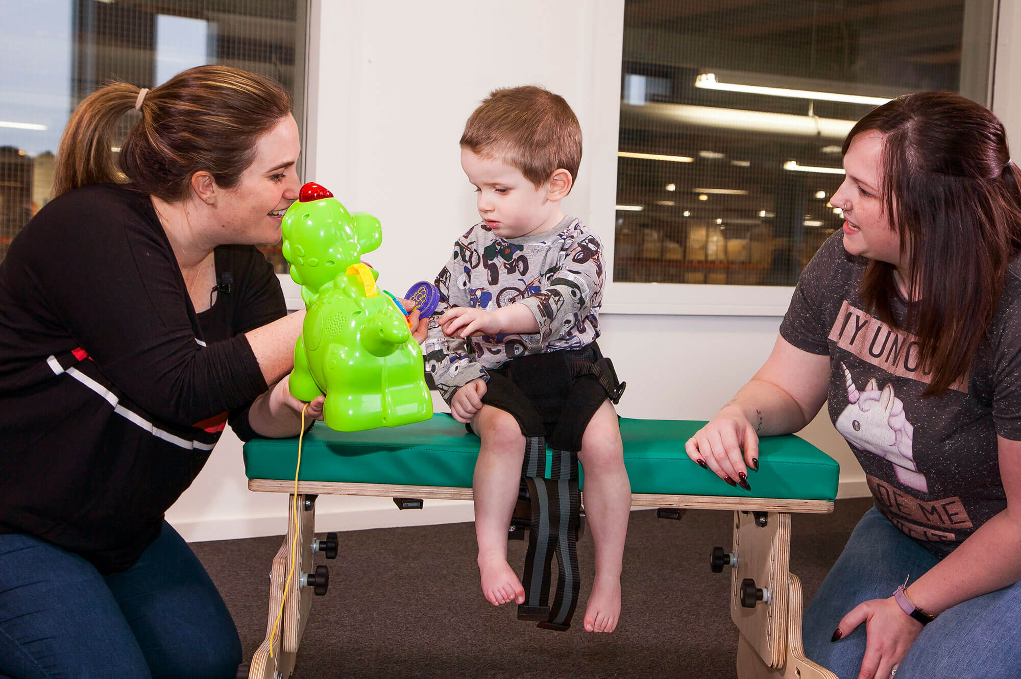 Den kroppsnære aktivitetsvuggen i kombinasjon med den bakre bolputen muliggjør øyekontakt, og at terapeuten fritt kan engasjere seg med barnet. Leckey Therapy Bench benyttes ikke bare under vurdering av bolstabilitet, men også som et individuelt verktøy i ethvert terapiprogram.
