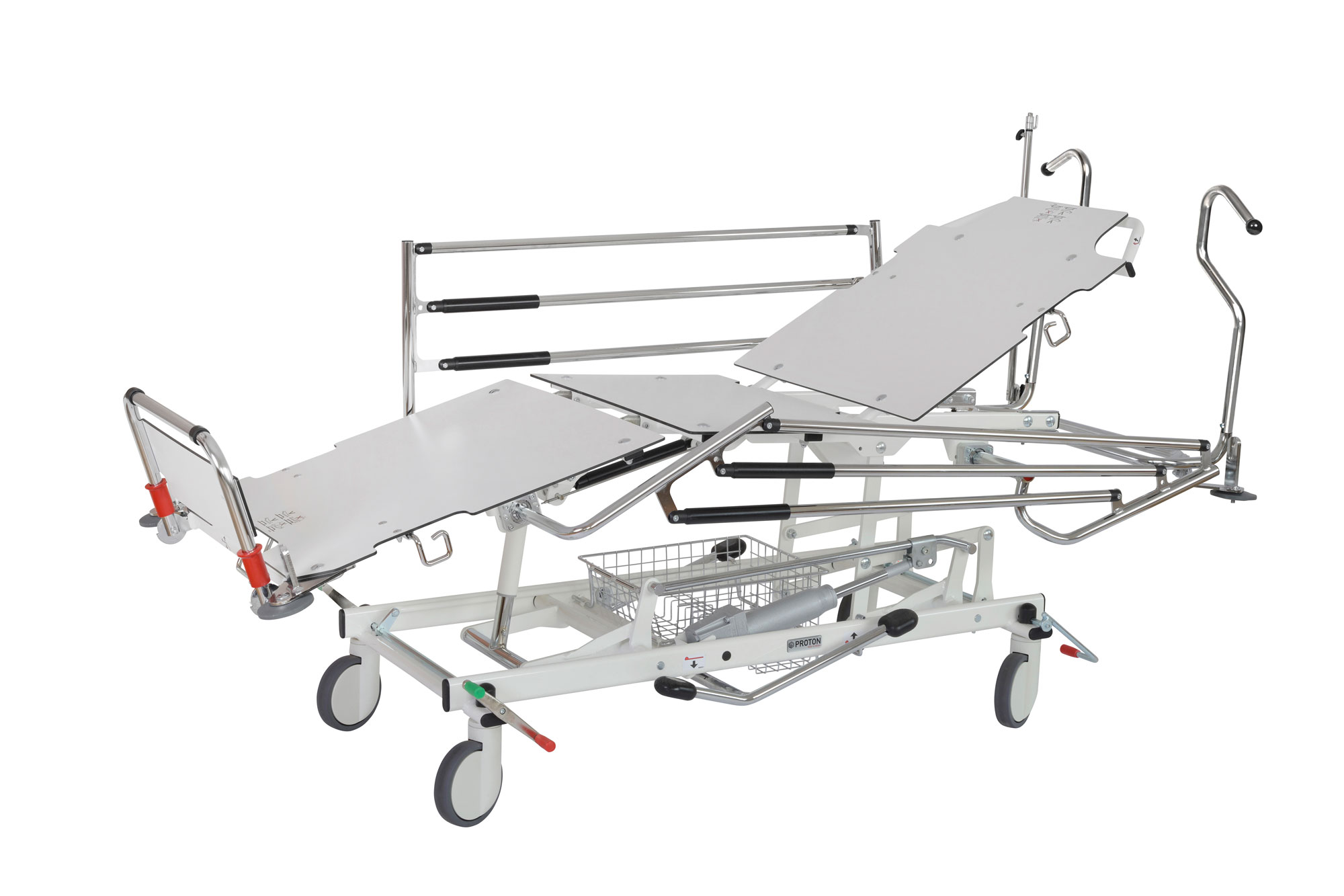 Rask og enkel posisjonering av pasienten med lett tilgjengelige håndtak for justering av posisjoner, rygg, ben, sjokkleie.