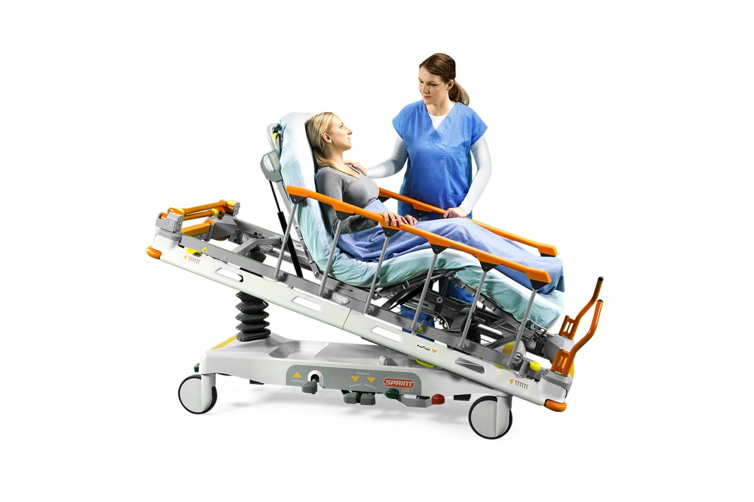 Akuttvogn Linet Sprint 100 er utformet med tanke på sikkerhet, ergonomi og komfort. Liggeflaten er enkel å stille inn, bl.a. som hjertestol. Sidegrinder sørger for ekstra komfort og sikkerhet, mens mulighet for et femte hjul med demping gir komfortabel og stabil manøvrering.